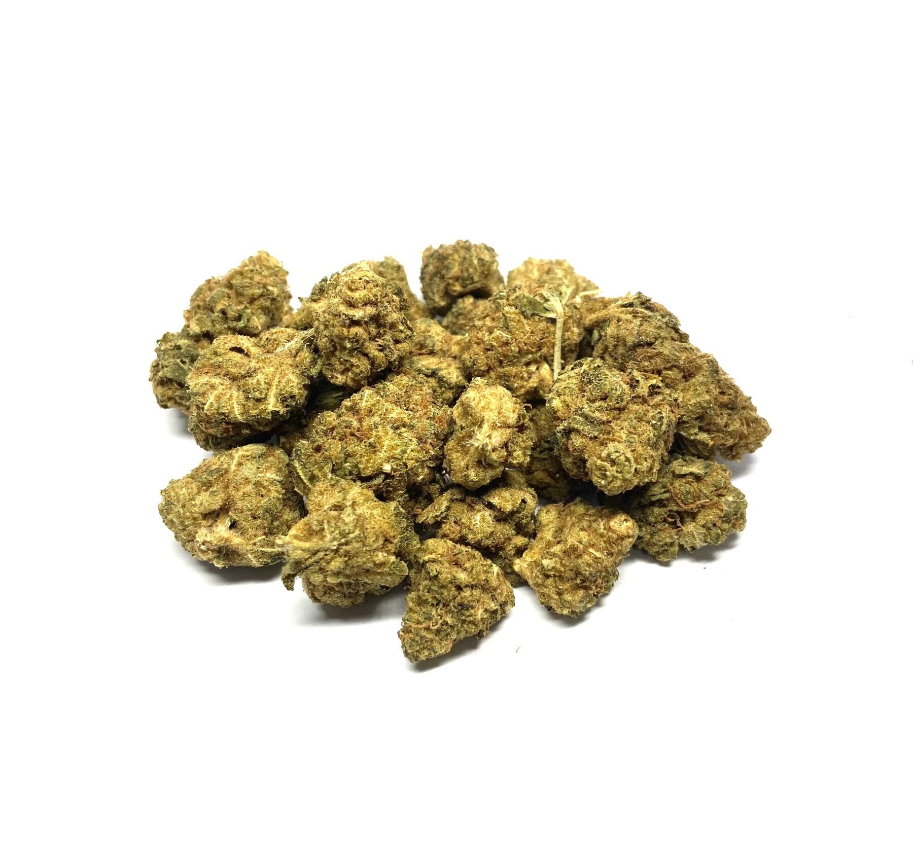 Runtz is an evenly balanced hybrid strain (50% indica/50% sativa) created through a delicious cross of the infamous Zkittlez X Gelato strains. Named for the iconic candy, Runtz brings on a super delicious fruity flavor with tropical citrus and sour berries galore. The aroma is very similar, although with a sharp spicy pineapple effect that turns slightly pungent as the sticky little nugs are broken apart and burned. The Runtz high comes roaring in a few minutes after your final toke, first hitting your head with a calming lift before spreading its tingly tendrils throughout the rest of your body. As the Runtz high expands, you’ll begin to feel a deeply calming effect spread through your limbs, leaving you totally sedated and couch-locked, immovable for hours and hours on end before you finally fall into a deep and peaceful sleep. Thanks to these effects and its super high 19-29% average THC level, Runtz is often said to be perfect for treating conditions such as insomnia, chronic pain, appetite loss or nausea and chronic stress or anxiety. This bud has dense grape-shaped olive green nugs with thin orange hairs, dark purple undertones and a coating of frosty tiny white purple-tinted crystal trichomes.